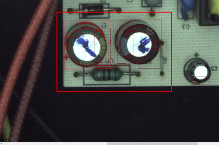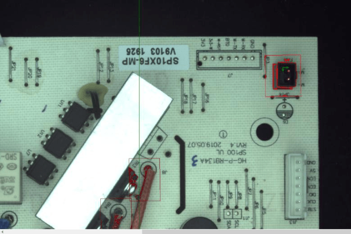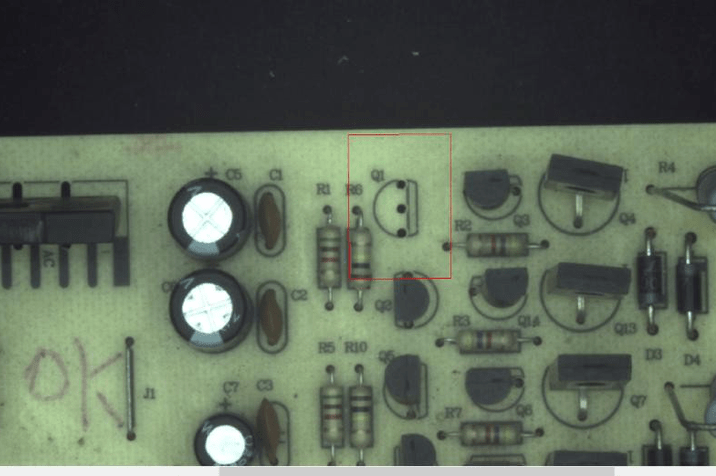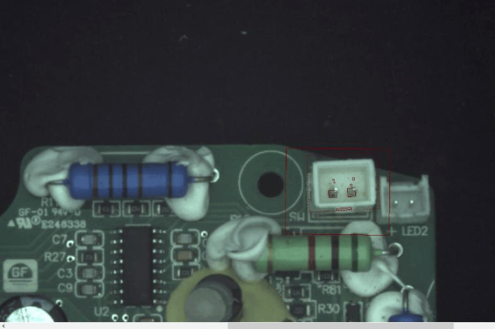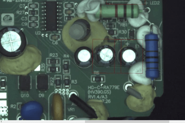 檢測流程如下:產品就位后客戶設備端給出觸發信號,工業相機完成圖像采集,PCB板元器件智能視覺檢測系統對檢測內容(元器件(插件)混料檢測、元器件(插件)有無檢測、元器件(插件)正負極檢測、元器件(插件)顏色檢測、元器件(插件)方向檢測、焊線顏色檢測、端子座顏色檢測、端子座方向檢測)進行高效分析處理。并將處理后的結果,輸出OK/NG結果給到客戶指定端,整體檢測結果示意圖如下;